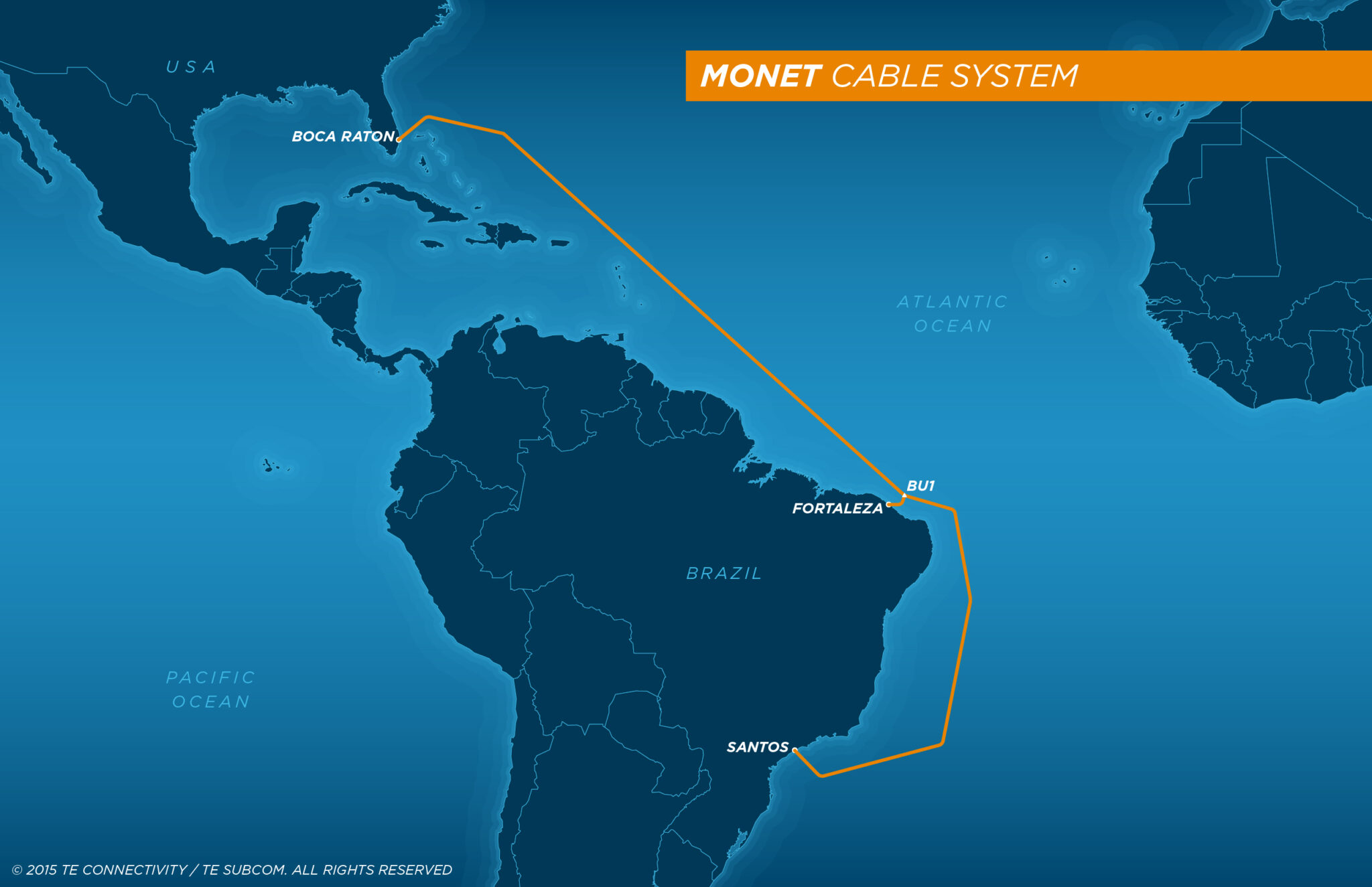 The Monet submarine system is owned and operated by Algar Telecom, Angola Cables, Antel, and Google. It was designed and built by TE SubCom using their “open cable” concept to improve connectivity between North America and South America.